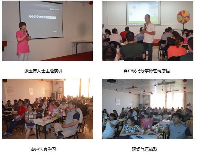随后的会议中网站客服部经理张玉霞女士为大家作了“每个个体都有自己的品牌”主题演讲,从日常生活出发,引出移动互联应用在现代生活中的重要性和必要性,尤其着重点出微信的重要性。又从典型案例论证微信营销带来的企业经营的重大改变和效益提升。最后着重讲解微营销的优势和便利,在场客户亲身分享微营销带给自己生活的改变和自己学习微营销的重大决心。在场客户无不关注微营销知识分享。