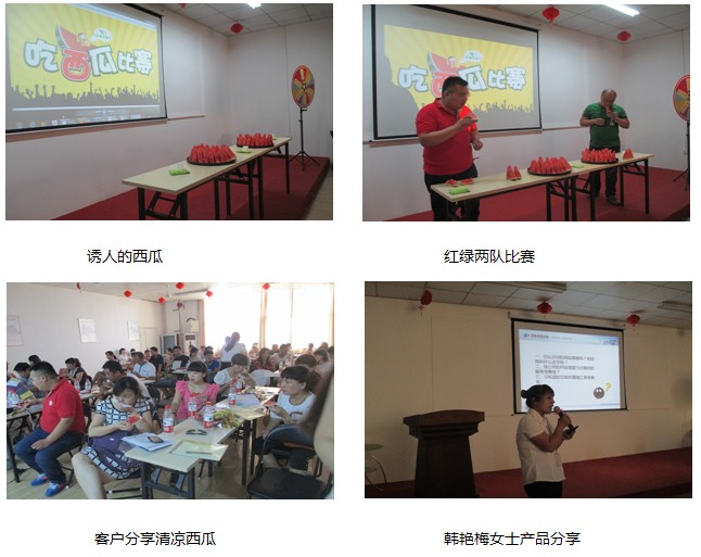 会议的尾声,进行了有趣的吃西瓜大赛。红队和绿队分别派出两名代表进行参赛,清凉的西瓜,火热的比赛为会议带来诸多欢乐和精彩。而后大家一起分享西瓜,炎炎夏日,每个人都收获了知识和凉爽。最后网站客服韩艳梅女生为大家分享了更多的青峰营销知识和营销产品,现场客户都表现出了浓厚的兴趣。